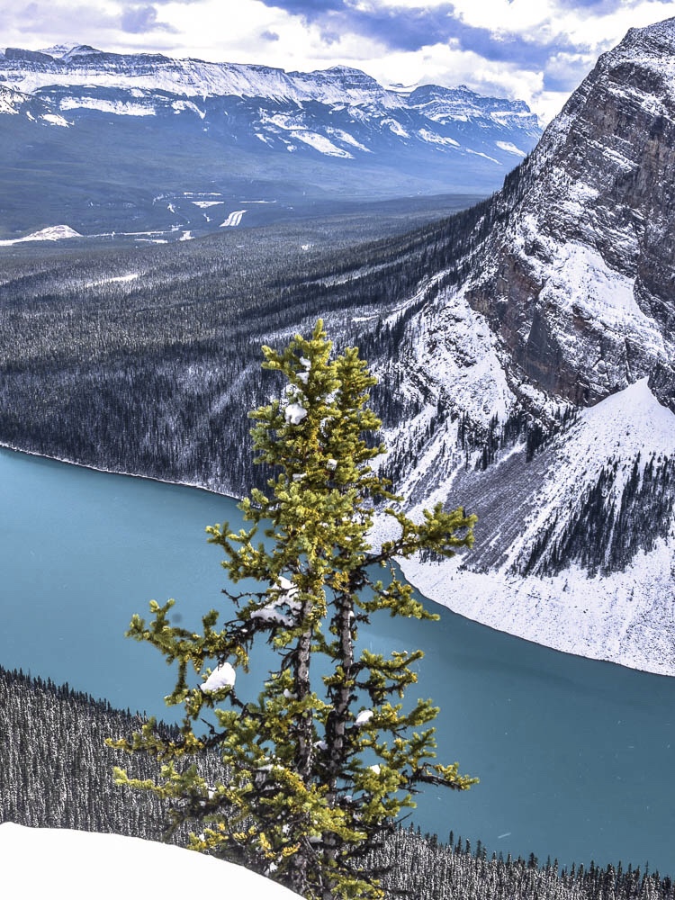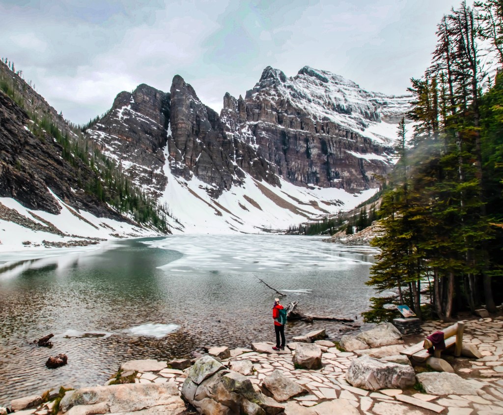 par un sentier abrupte mais facile dont a une vue plongeante du lac Agnès et plus haut une vue des montagnes et du lac Louise . Ici une vue en fin mai lors d’un printemps hâtif , en général le lac est partiellement gelé .