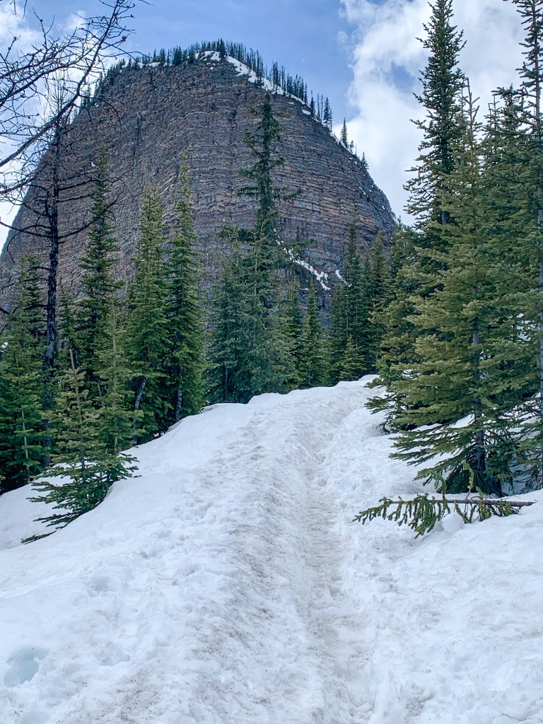 On peut y voir déjà le lac Louise après cette section . Normalement il est toujours gelé en mai .